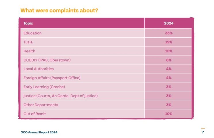 In addition, in 2024, 15% of complaints to the OCO were about Health services. These included issues over access to Children and Adult Mental Health Services (CAMHS), children in hospital beyond medical need, a lack of access to an Assessment of Need and other HSE funded services.