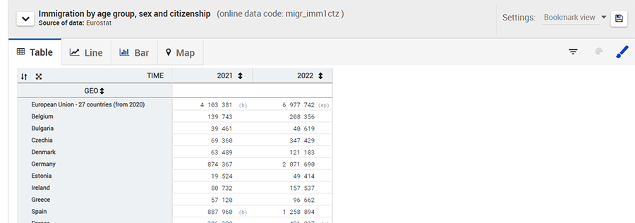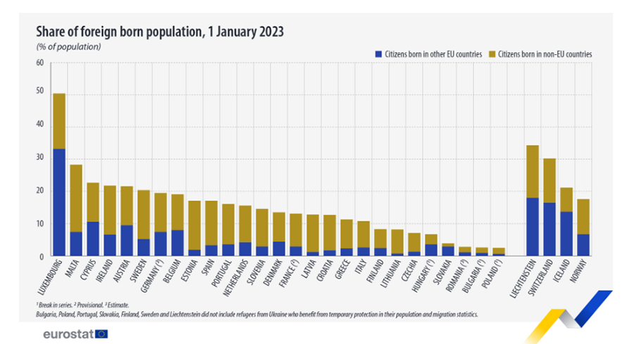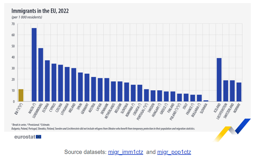 Newly published EU statistics on immigration show that the proportion of the population of the Irish state who were born overseas reached 22% in 2023.