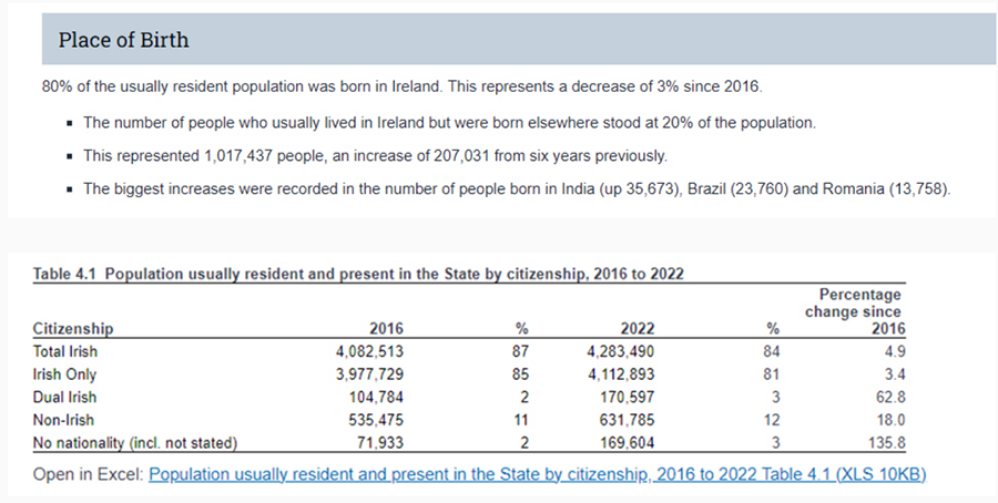 According to the EU statistics, as set out in the table below, 157,537 people migrated to Ireland from overseas between 2022 and 2023. Which means that of a population growth of 211,311 that 75% of that growth was accounted for by immigration. If that trend continues, and it looks set to increase rather than otherwise, then we are on course to have another 2 million persons who were born overseas living here around 2050.