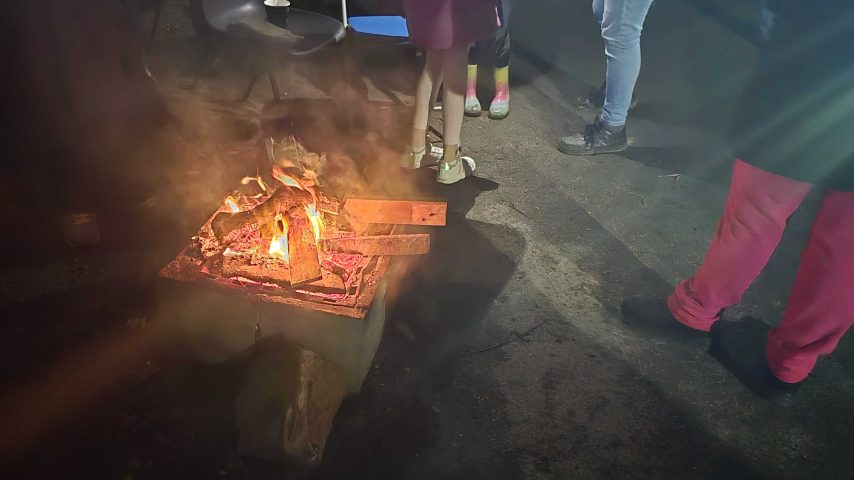 A crowd made up of men and women of diverse ages as well as children gathered around two fire pits as the evening drew in.