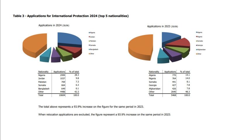 According to IPAS statistics, 10,604 persons have applied for asylum here since January 2024 – a 93.9% increase on the figure for the same period in 2023.