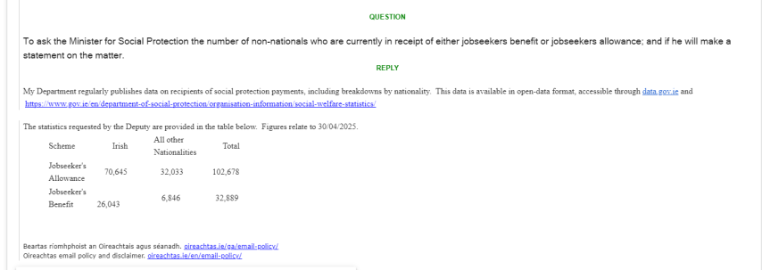 These show that of the 135,567 people claiming unemployment payments that 29% were of “other nationalities.” It is not clear from the Minister’s response whether that refers to people who are citizens of other countries or to all people who were born outside of the state.