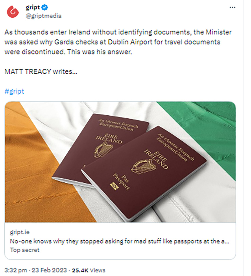What is clear – and statistics on people who arrive without any with “false or no documentation,” a total of 5,074 between January and November 2022 alone, which Gript and others have accessed through Freedom of Information and Dáil questions, confirm this – is that the Minister and her Department are in effect referring to large numbers of illegal immigrants.