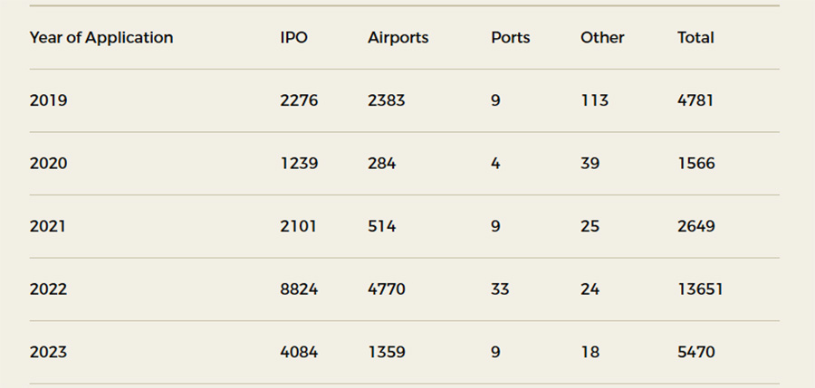 These are accounted for in the statistics as airports and sea ports, with a small number – just 219 or less that 1% of the total – who apply in some ‘other’ manner.