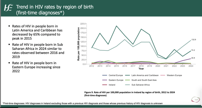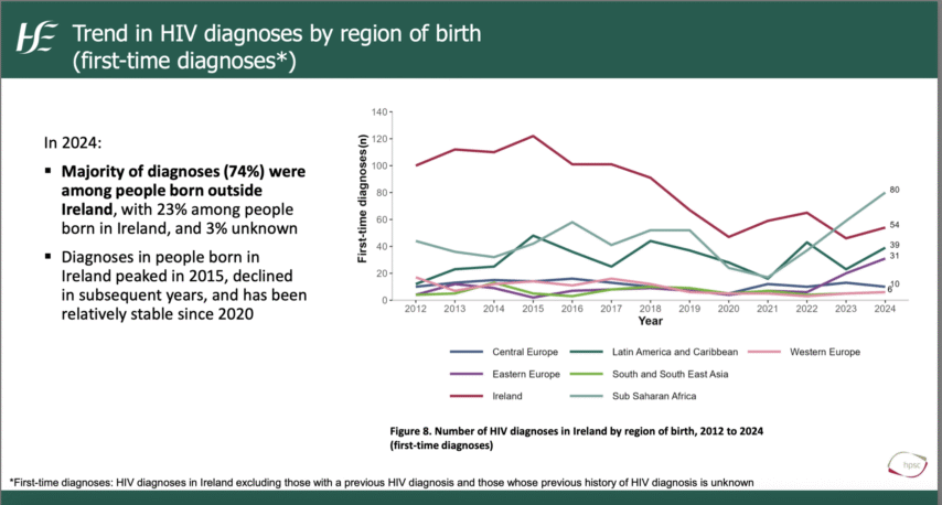 Higher HIV rates were seen among both men and women born outside Ireland. 97 people were diagnosed with late-stage HIV infection in 2024, representing 41% of first-time all diagnoses.