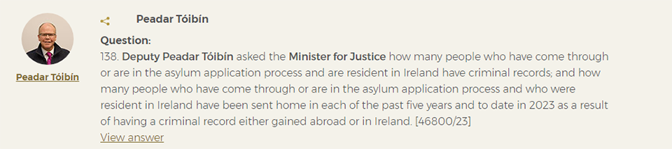 Her response to other questions from Deputy Tóibín would also indicate that the claim the State is “cracking down” on “applicants who have committed crimes in other countries” does not seem to be exactly a full description of the situation as it stands, whatever about the Minister’s intent for the future.