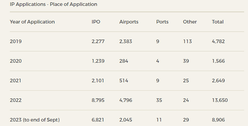 What was not discussed in depth was the revelation in the table supplied by the Minister – which, on inspection, shows that an enormous 77% of those claiming asylum in 2023 to date did so by turning up at the International Protection Office, instead at the airports or at a port or elsewhere.