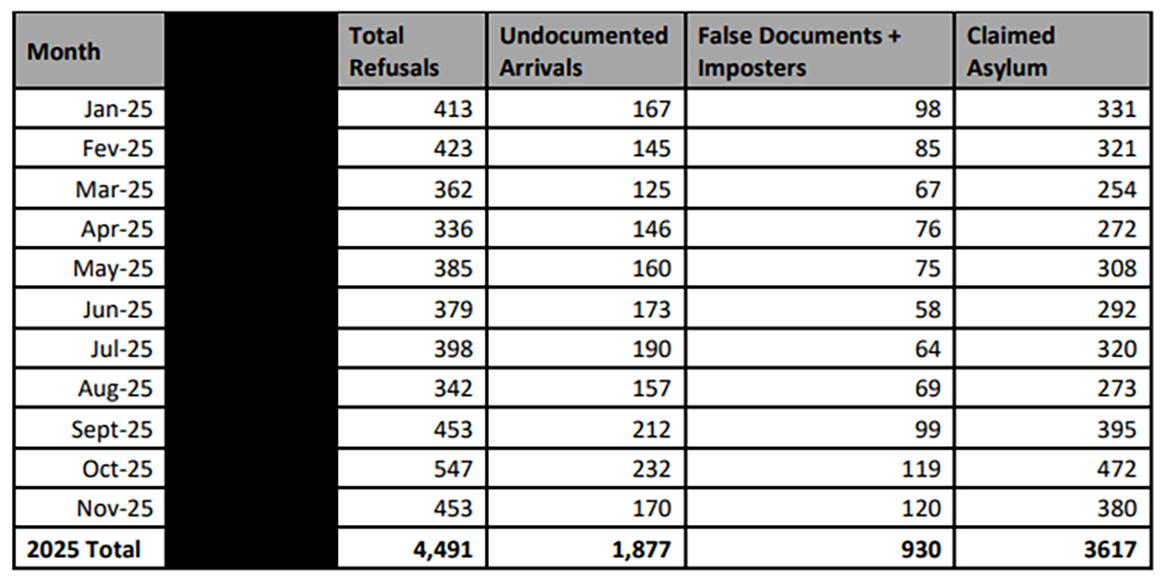 The total number of refusals for people arriving into the state with either false or no documentation up to the end of November was 2,807 compared to 3,370 for the whole of 2024. If December follows the same pattern, then the monthly average for 2025 will be down by 26, a modest decline.