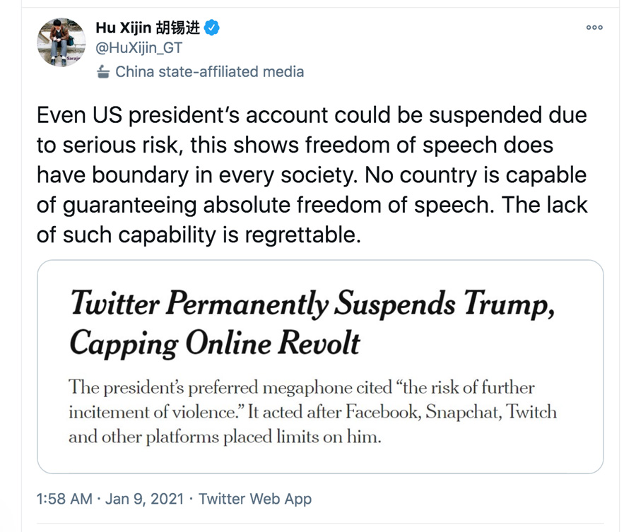 But the Chinese Communist Party welcomed the censorship of Mr Trump, saying it showed the need to curtail free speech, an action now synonymous with the Chinese government. It’s state affiliated media said the suspension of his Twitter account showed “freedom of speech does have boundary in every society”.