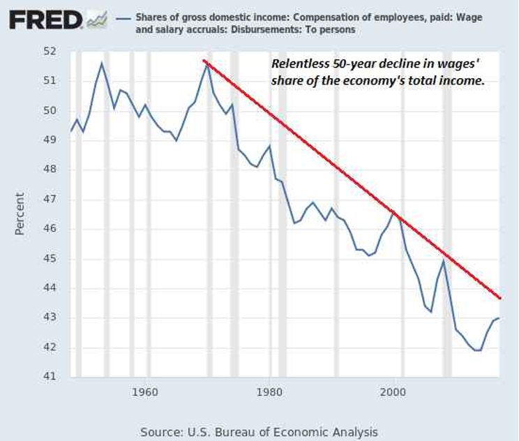 The ability to print money out of thin air (quantitative easing) enables government to fund all manner of mischief and causes ruinous inflation. This has global repercussions because the US dollar is the world reserve currency. Note the half-century decline in American wages, beginning in 1971: