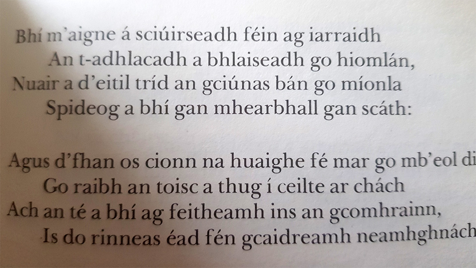 Cloisim tic – tic- tic ó bharr an sceach lasmuigh mo fhuinneog. Caithfidh mé an cháis a thabhairt amach sa clós. Agus fanacht.