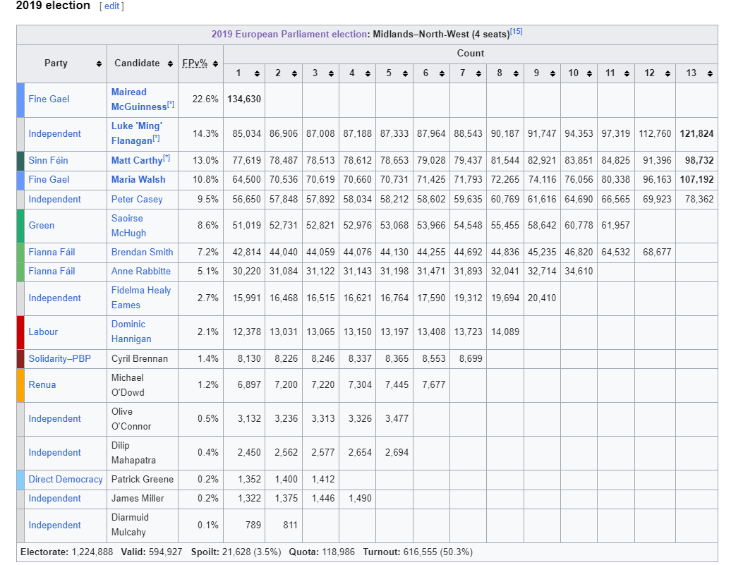 First, a word on what a surplus is: As mentioned in the original guide, the “quota” is the number of votes a candidate needs to be guaranteed a seat. A candidate can be elected with, or without reaching the quota – the count ends either when all the seats have been filled by candidates who reached the quota, or when the number of candidates remaining matches the number of seats remaining. This happened in the 2019 European Election in Midlands North West, for example, where Sinn Fein’s Matt Carthy and Fine Gael’s Maria Walsh were elected over Independent Peter Casey despite none of them reaching the quota of 118,986 votes: Because there was just two seats left to be filled and three candidates left, Carthy and Walsh took the seats by virtue of having more votes at that stage than Casey: