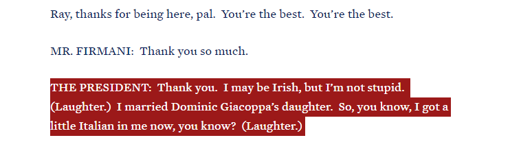 As can be clearly heard, Biden remarks, apropos of a previous comment, that “I may be Irish but I am not stupid.” The official White House site passes the whole thing off as a gas thing that your man said – just as they would had he said “I may be Mexican, but I’m not an illegal immigrant.” Joking, of course. It is also notable that while the official transcript claims that “(Laughter)” was the response, it is not that noticeable I have to say.