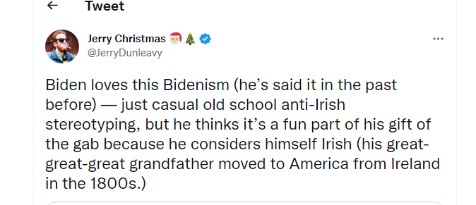 Like, what if, say, Boris Johnson had said such a thing? There would have been ructions. Absolute ructions. Or if instead of Irish, Biden had said something like “I may be (fill the blank) but I don’t loot Foot Locker,” or “I may be ….. , but I don’t control all of the banks.” Anyway, you get the picture.