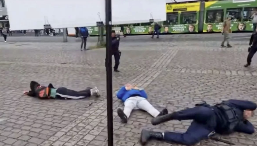 The video shows the man lunging at numerous people with a large knife in his hand with Stürzenberger sustaining what appears to be multiple stab wounds.