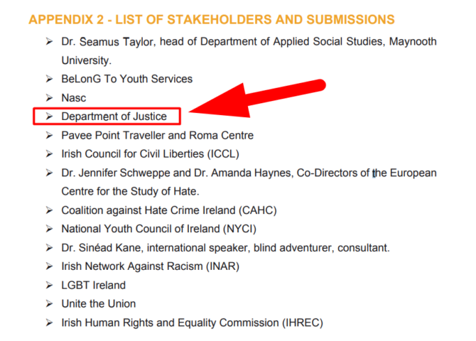 Moreover, the report lists 14 “stakeholder” groups and individuals who were consulted about the hate speech bill. Every single one of these unanimously supported hate speech laws, and among the organisations consulted was Justice Minister Helen McEntee’s own Department.