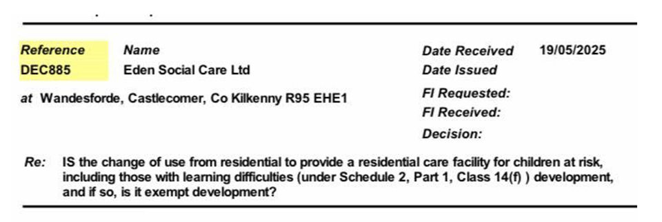 An application has been lodged with Kilkenny County Council for a change of use of an existing Bed and Breakfast over to “a residential care facility for children at risk”. The application requests the planning authority to confirm if it is exempt under Schedule 2, Part 1, Class 14(f) of Statutory Instrument 600/2001.