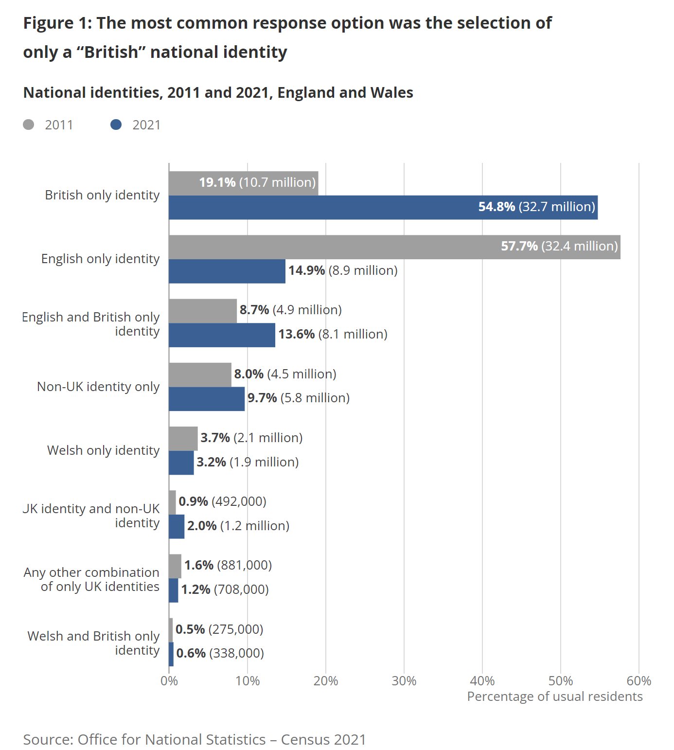 Other results from the census show a decrease in the number of those who are white. 81.7 per cent (48.7 million) usual residents in England and Wales identified their ethnic group in the ‘white’ category – which marks a decrease from 86.0 per cent (48.2 million) in the 2011 census.