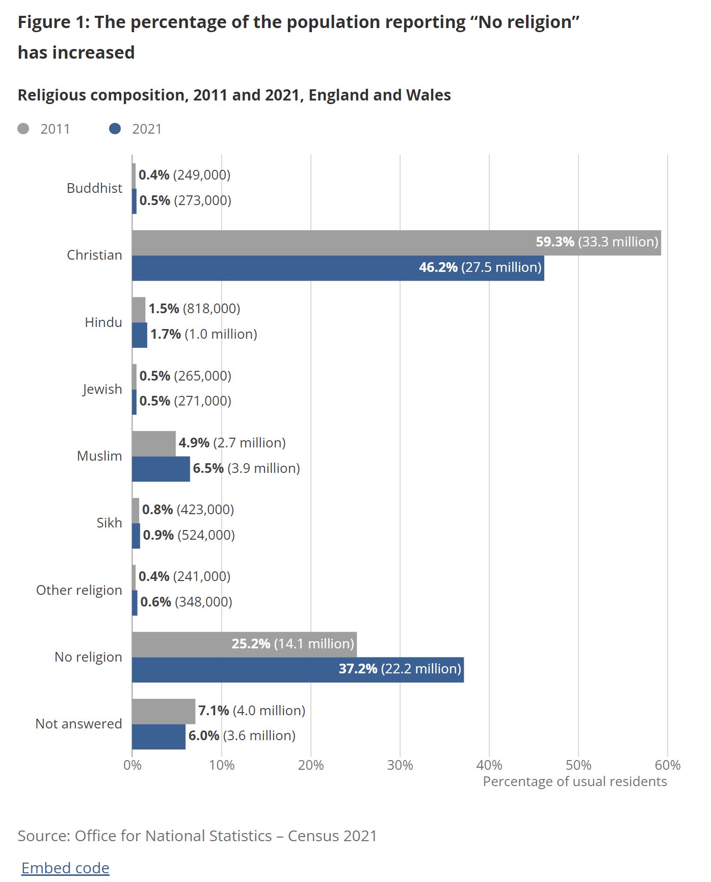 Christians now make up less than half of the UK population for the first time in census history, with the proportion of the British population who class themselves as Christians dropping to 46.2 percent (27.5 million people) in 2021, representing a drop of 5.5 million in the number of Christians in the last ten years. Christians are now outnumbered by non-religious people in Wales.