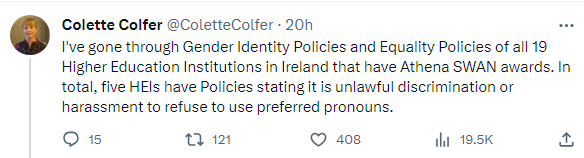 Colette Colfer, the South East Technological University lecturer at the centre of the controversy over compelled speech and gender pronouns, has discovered that five of the 19 Higher Education Institutions in the state are claiming it is “unlawful discrimination or harassment” to refuse to use preferred pronouns.
