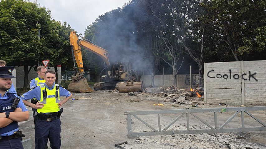 A JCB digger, which was being used to dismantle the protest camp, was set on fire, setting the scene for hours of protest and chaos in the area as Gardaí and protesters repeatedly clashed: with pepper spray being used against the Coolock Says No group who gathered in their hundreds, while Gardaí said missiles had been thrown at members of the force as tensions grew.
