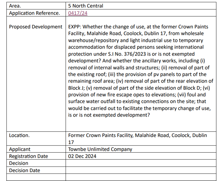 One of the planning-related applications made to Dublin City Council before Christmas was from Townbe, the company that is seeking to open an accommodation centre for applicants for International Protection at the former Crown Paints factory site in Coolock.