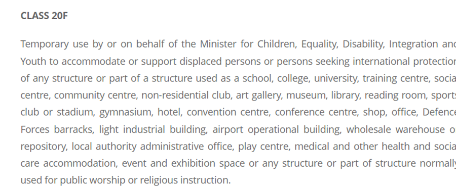 Perhaps then, Townbe and the other potential accommodation providers took note of Justice Holland’s reference to it being open to Dublin City Council to reject the claim that the proposal was exempt under Class 20F and to “take enforcement proceedings if needs be – as could any other person.”