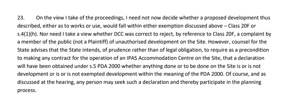 Which, one might think, makes it all the more interesting that Townbe and others have felt it necessary, since the October High Court decision, to specifically request that DCC state whether or not the exemption applies to all aspects of specific proposed IPAS centres including renovations.