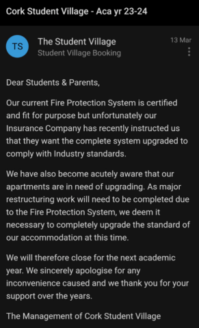 In an email seen by Gript dated the 13th of March 2023 sent from the management of the company it was claimed that Cork Student Village was instructed by its insurance company that the complex required a “complete system upgraded to comply with Industry standards”.