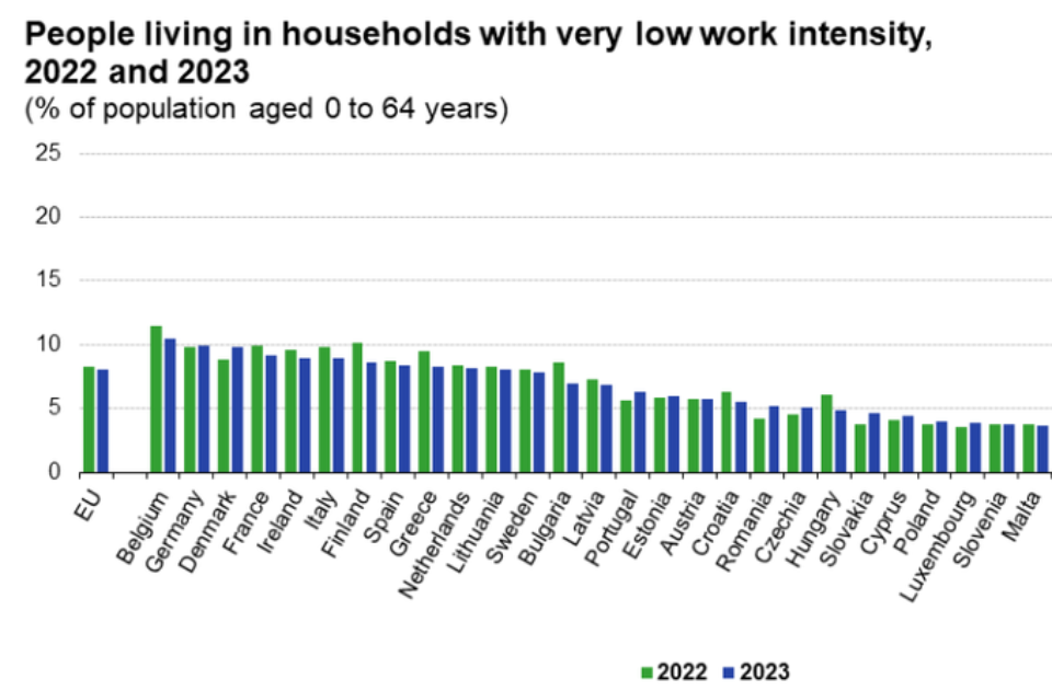 Ireland’s leftward focus on income distribution means that we have the system in Europe that does the most to tax income and to boost welfare. This discourages activity – it’s one of the factors behind Ireland’s shortage of workers and large-scale immigration. It encourages inactivity – we have one of Europe’s highest levels of people living in households with very low work intensity.