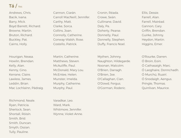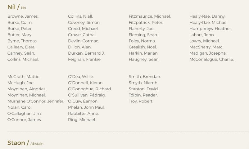 Fianna Fáil also allowed TDs to support the motion, with leader Micheál Martin confirming last week that TDs would have a free vote on “issues to do with life”, or issues of conscience. The Green Party also came out in favour of accepting the report, urging its TDs to support it.