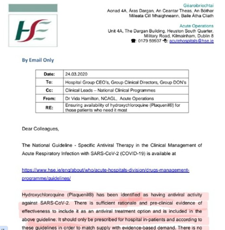 Representing himself, Dr de Brun took the opportunity to ask Dr Rita Doyle about an email circulated from the HSE to hospital group CEO’s on March 24 2020, regarding the use of hydroxychloroquin.