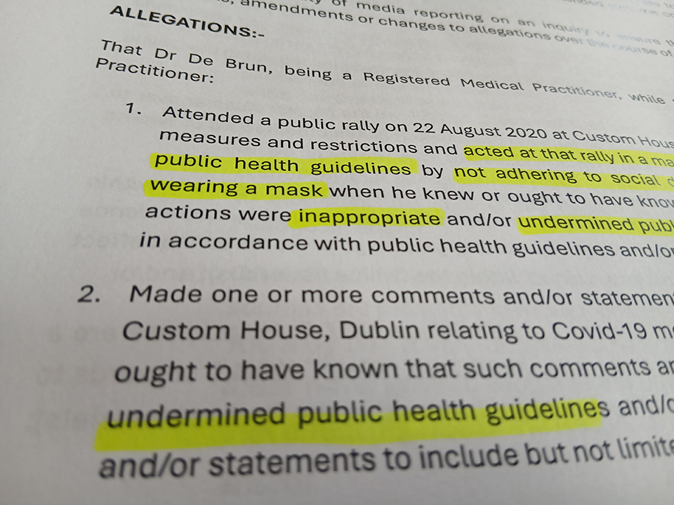 Dr de Brun is facing ten allegations of profressional misconduct over a series of tweets questioning of NPHET covid policy, face masks, lockdowns and vaccine safety.