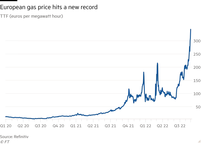 This graph from the Financial Times shows the stratospheric rise in gas prices, as the amount now being paid on the Title Transfer Facility, Europe’s leading trading hub, reached record highs.