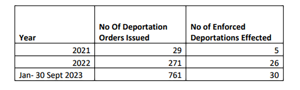 So, while the Minister is correct in stating that the numbers of deportation orders “are increasing,” over 90% of deportation orders still rely on those who receive the orders to self-deport themselves from the state.