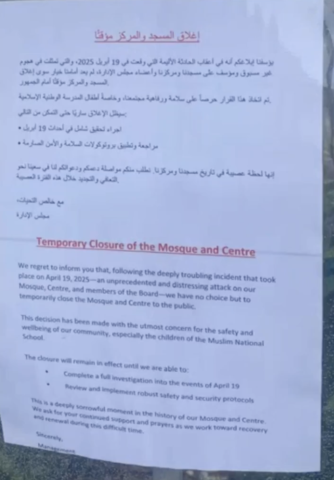 The notice advised that the incident was “unprecedented and distressing”, adding that the decision to temporarily close the centre “has been made with the utmost concern for the safety and well-being of our community, especially the children of the Muslim National School.”
