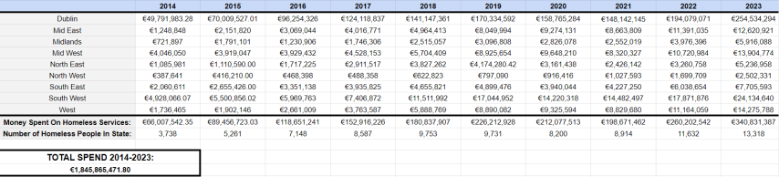 The Department figures break down the amount of money spent by local councils across the country, listed by year and region, such as “Dublin”, “Midlands,” “North West”, etcetera.