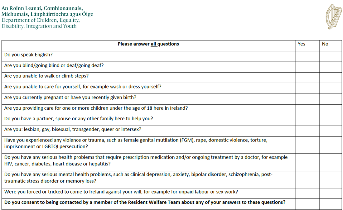 The vulnerability assessment programme had been in operation since December 2020 and was overseen by the Resident Welfare Team within the International Protection Accommodation Service and administered using a voluntary questionnaire and referral process.