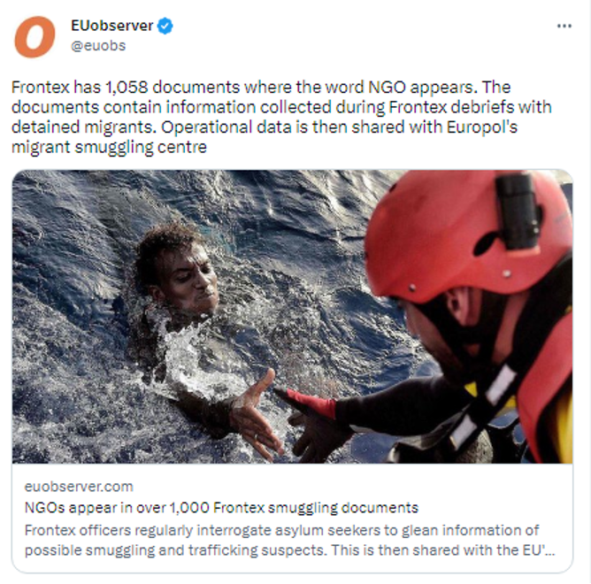 The EU Observer news site submitted a “freedom of access” – the same as a Freedom of Information request here – to Frontex which revealed that 1,058 documents related to the investigation of human trafficking include references to named NGOs.