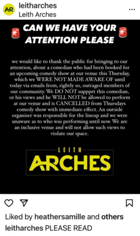 “We DO NOT support this comedian, or his views, and he WILL NOT be allowed to perform at our venue, and is CANCELLED from Thursday’s comedy show with immediate effect. And outside organiser was responsible for the lineup, and were unaware as to who was performing until now. We are an inclusive venue and will not allow such views to violate our space.”