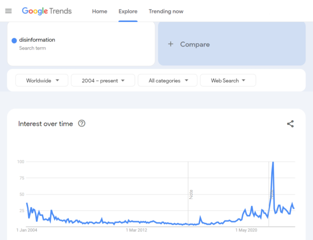 But before even delving into those sorts of objections, it’s worth reversing for a moment and wondering where this sudden ubiquitous obsession with the phrase “disinformation” even comes from. After all, it’s clear from Google Trends that there was a very unusual worldwide spike in the term’s usage around the middle of 2022.