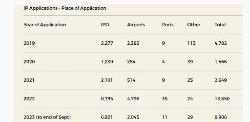 Gript readers will also be aware that there has been a steadily increased percentage of asylum applications made in the state that are presented directly at the IPO office in Mount Street rather than at a point of entry into the state which would be the normal procedure for persons claiming protection. As can be seen from the table below, the number of applications for asylum made at ports and other points are minimal.