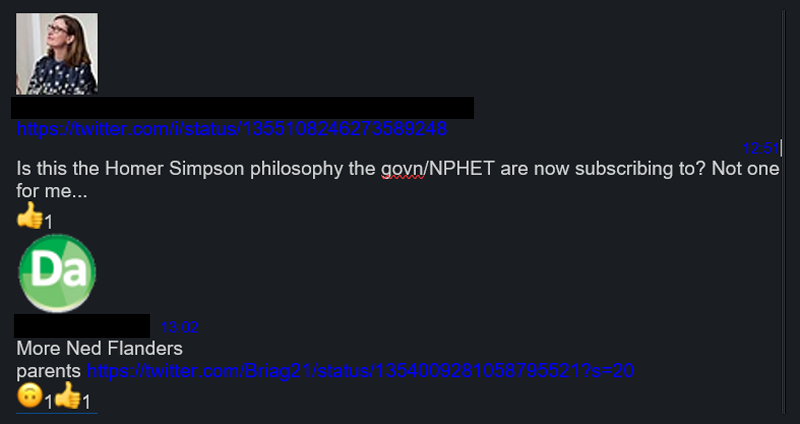 Killeen’s mockery of the Independent TD Michael McNamara is particularly interesting as McNamara, as the Chair of the Dail’s COVID-19 Committee, had invited members of ISAG into the Committee to discuss “Strategic options for using the Government Plan to eliminate community transmission in Ireland.” Publicly ISAG members thanked him; Dr Sam McConkey called it a “privilege” to be allowed speak to the Committee. Privately McNamara was mocked and described as just another part of a “string of other charlatans” who ISAG might have to show up as “paper thin and nasty.”