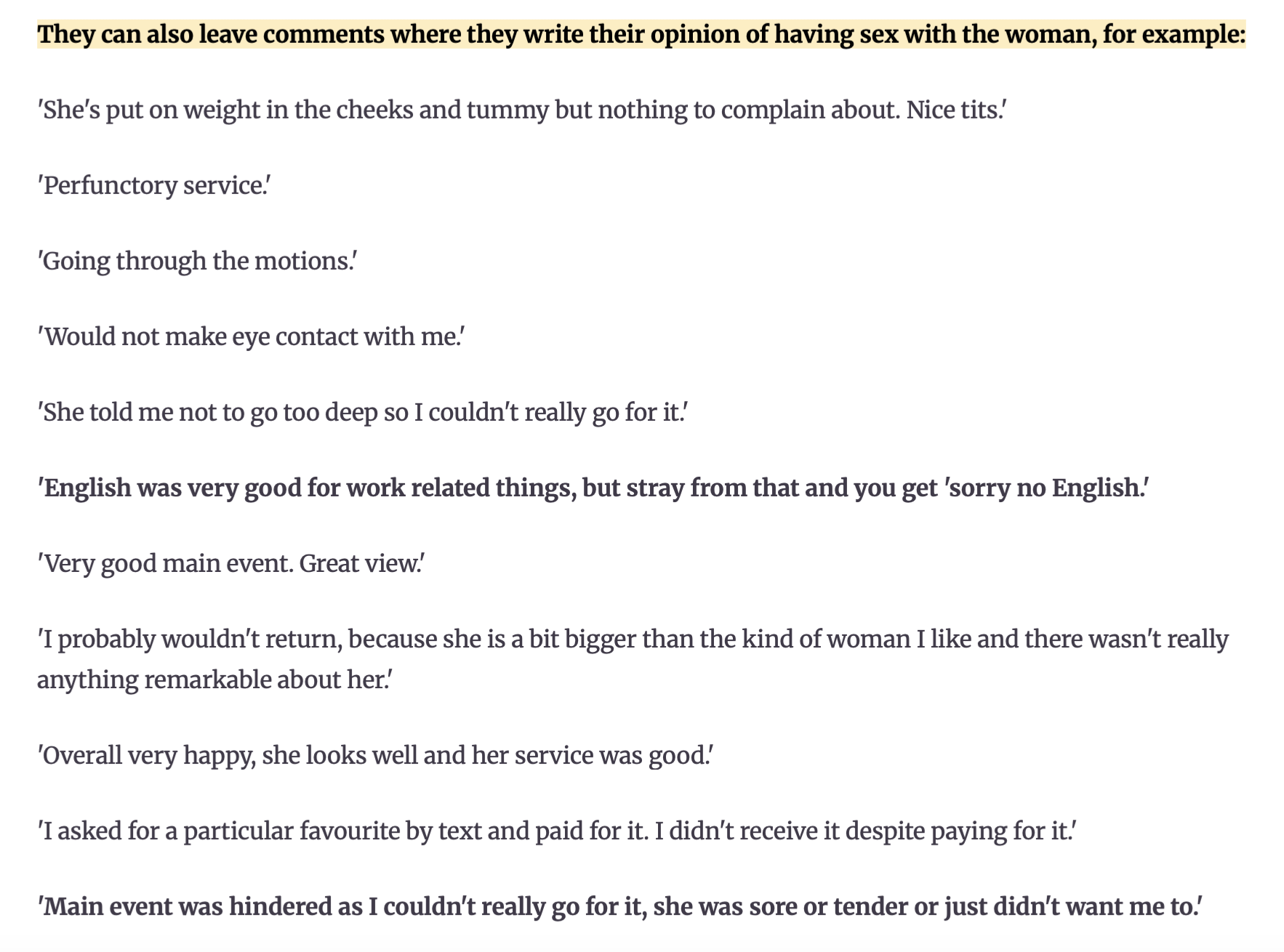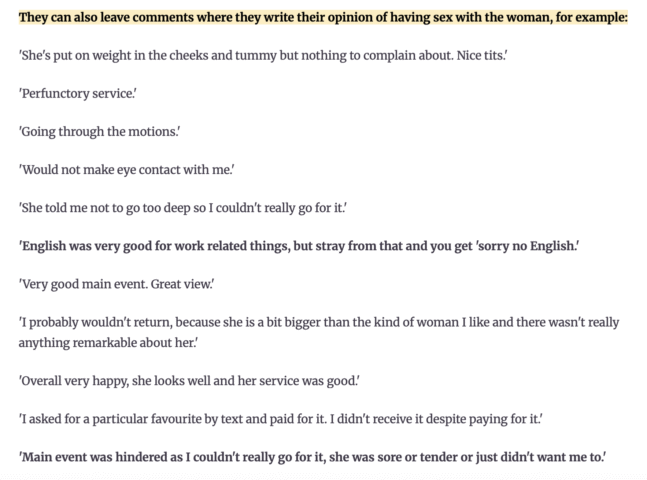 Men can look at women’s pictures, as well as their ‘favourites’ (sex acts the women will allegedly do) and read their ‘reviews’. Male users rate women out of 5 stars for ‘physical appearance’, ‘location’, ‘satisfaction’, ‘value for money’ and ‘overall experience’.
