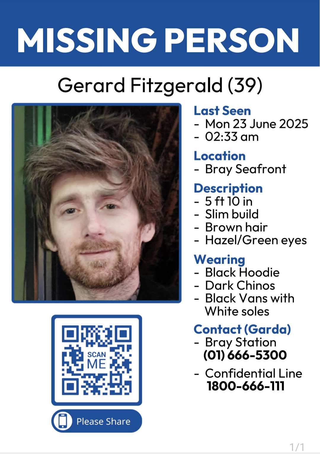 Gardaí are seeking the public’s assistance in tracing the whereabouts of Gerard Fitzgerald (39), who has been reported missing from Bray, Co. Wicklow since Friday 20th June 2025.