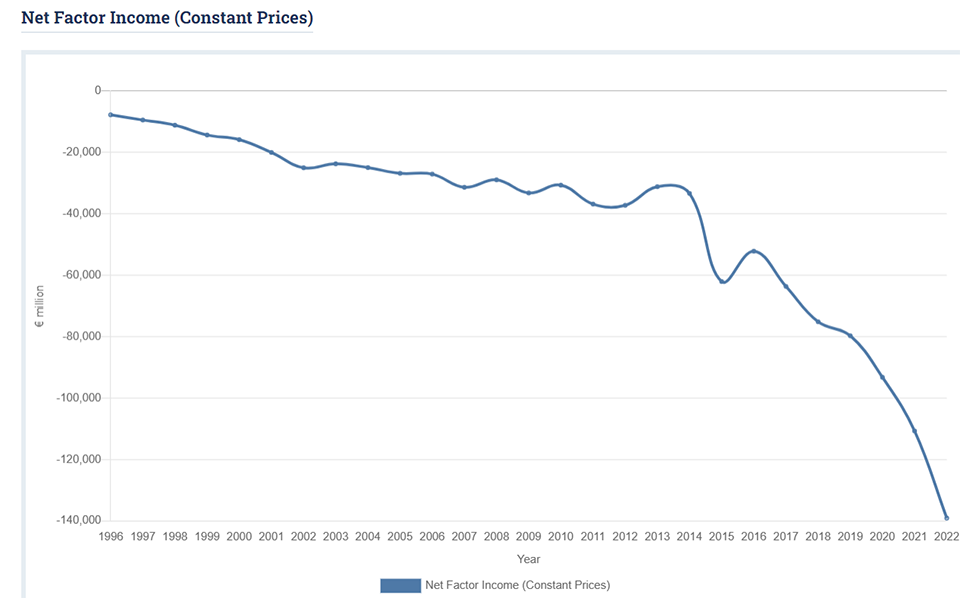 A graph compiled on the basis of the CSO’s own charting of the growth of Net Factor Income here between 1996 and 2022 is a stark illustration of the huge transfers of wealth out of the Irish state. That increased from a negative of €7.76 billion in 1996 to €139.1 billion in 2022.