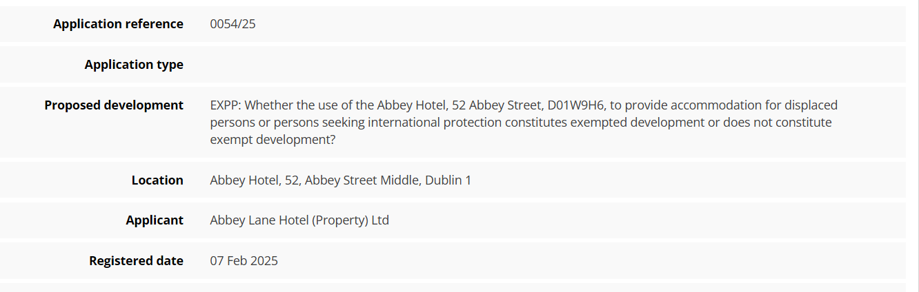 A businessman who has had several of his enterprises run afoul of the Revenue Commissioners last week applied to Dublin City Council for a ruling on whether the Abbey Hotel in the centre of Dublin can be exempt from planning permission for the purposes of turning it into yet another asylum centre.