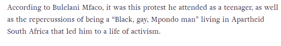 Mfaco told Gay Community News last year that he was involved in political protests in South Africa and that it had been his experience as a “’Black, gay, Mpondo man” living in Apartheid South Africa that led him to a life of activism.”