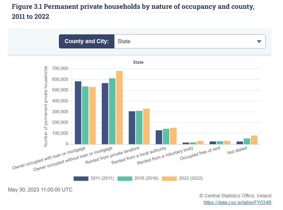 In the meantime the proportion of persons living in private rented accommodation has begun to climb steadily upwards again. It had fallen from 26% at the end of World War II to just over 8% in 1991. In the 2022 Census, that figure had reached 19%, and the overall % of households in rental accommodation was 29.2%.