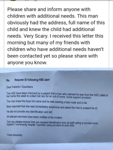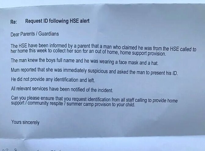 Parents shared the HSE’s letter widely on social media, expressing deep concern that the alleged would-be abductor knew the child’s personal details.